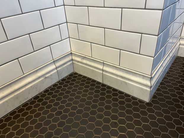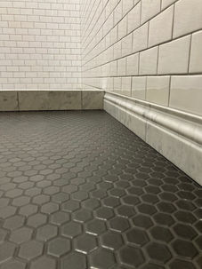 This bathroom remodel is in the Ladd Ave. House. This small bathroom was just a powder bath originally but I grabbed a little extra space from a closet in order to add this beautiful 5'x5' shower. In order to keep changing any of the historic exterior I tile around the old double hung window and installed frosted shower glass in front of it. It porcelain subway tile in the shower and wainscoting and has beautiful black penny hex tile on the floor with Carrara marble base tile, shower curb and custom niche.